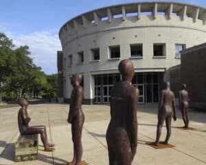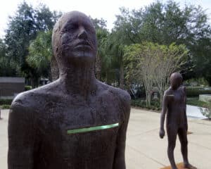 Steinunn Thórarinsdóttir is an Icelandic artist who has used the human form as her main means of expression throughout her career. She works with reliefs and free standing sculpture in various materials such as cast iron, aluminum, plaster, glass and concrete. Horizons is an installation that encompasses 12 life-sized cast iron androgynous figures, each embedded with horizontal lines of glass. The rough surface of these sculptures echoes the texture of the tree trunks, while bands of transparent glass allow the daylight to show through their lean bodies. The use of iron, which ages and weathers to develop a patina over time, connects the work to its natural environment. The figures stand precariously in the City of Orlando Sculpture Plaza allowing the visitor to explore and interact with the sculptures one on one.