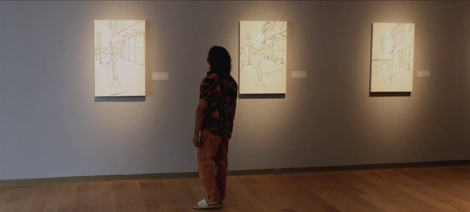 His latest series, presented in the Florida Prize, goes deeper: it chronicles the removal and reinstallation of a historic marker honoring Arthur Lee McDuffie, a Black man beaten to death by police in 1979. When Arroyo noticed the marker had come down, only months after its long-overdue unveiling, he returned again and again, capturing each stage of the site’s transformation. These paintings, rendered in stark black lines, evoke the feeling of architectural plans that are forever incomplete. A powerful reminder that public memory can be as fragile as a building scheduled for demolition.